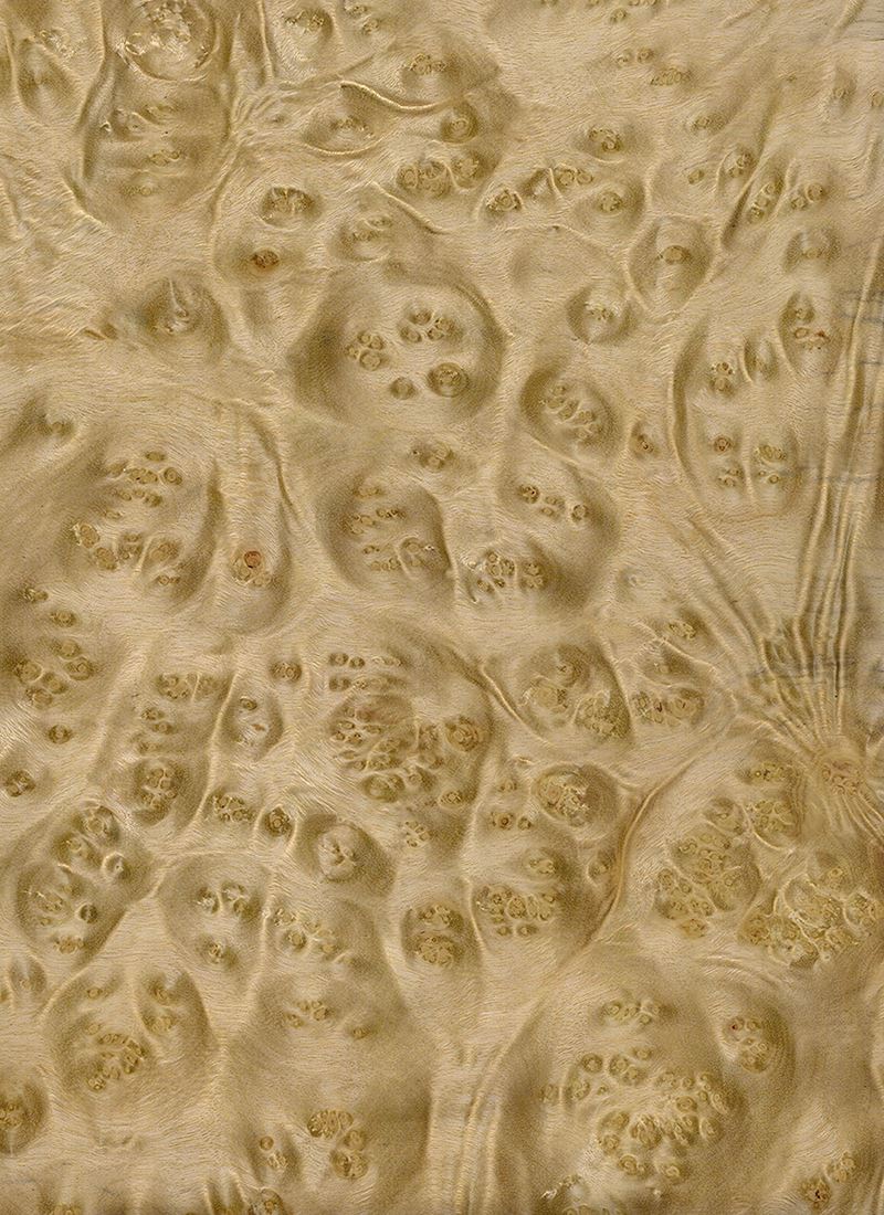 此树种木材表面非常像天鹅绒,有清晰和稍微粗糙的节瘤生长,颜色是金黄色。纹理通常是不规则和树瘤纹。